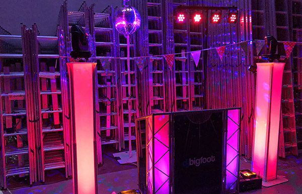 - 2 große Lichtsäulen mit Moving-Heads (bewegtes Licht)