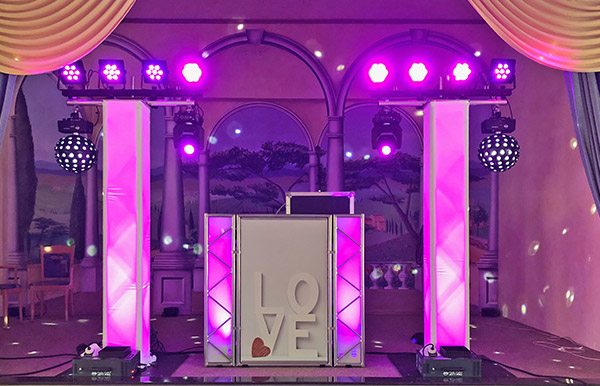 - 2 große Lichtsäulen mit Moving-Heads (bewegtes Licht)